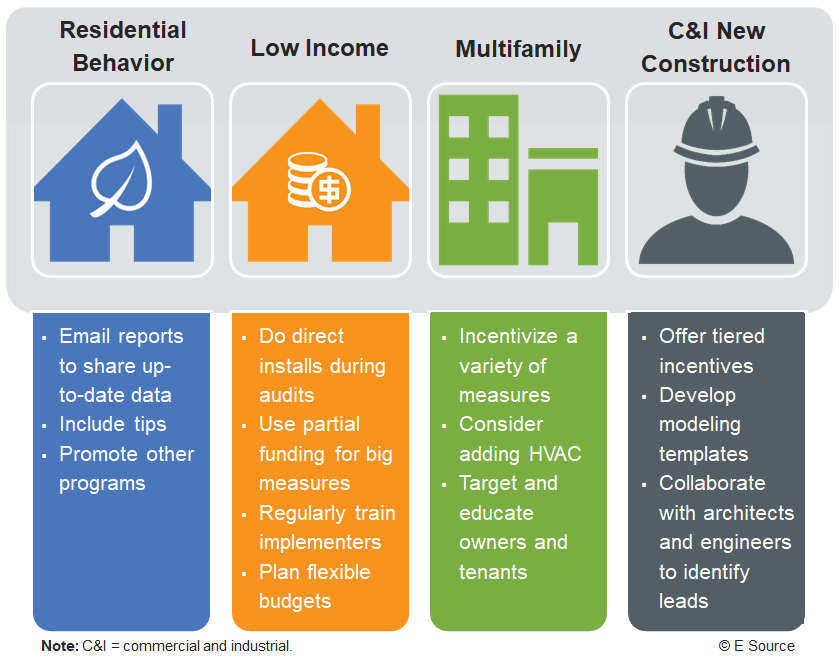 Lighting measures traditionally have been the most cost-effective component of energy-efficiency programs because they’re easy to install and provide high savings at a low cost. With the removal of lighting from programs, utilities are looking for new measures and strategies to maintain cost-effectiveness. As part of the E Source series on the “Next generation of energy savings,” we’ve identified program-specific best practices from some of the most cost-effective programs across four core program types: residential behavior, low income, multifamily, and commercial and industrial (C&I) new construction (Figure 1).
